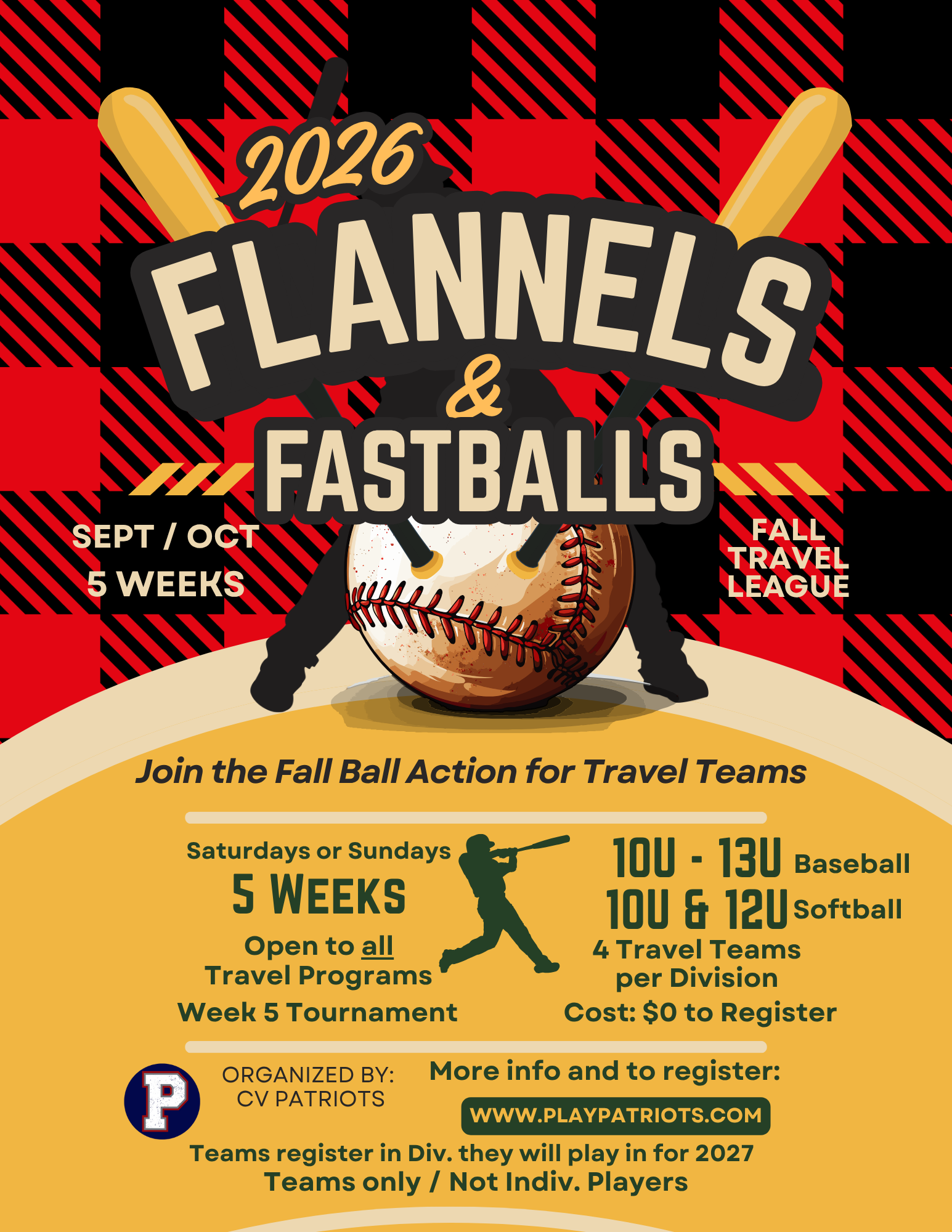 2026 CV Patriots Flannel's & Fastballs Games. Competitive Travel Baseball focused on building skills, character, and a love of the game on and off the field. The CV Patriots program supports teams from 8U - 17U. Leveraging local league relationships, we'll play a 5-week season (1/2 home and 1/2 away) from Sept - Oct, weather dependent. Our goal is 4 teams per division. Cost to register your travel team is $0. Teams' setup a home and away schedule.
