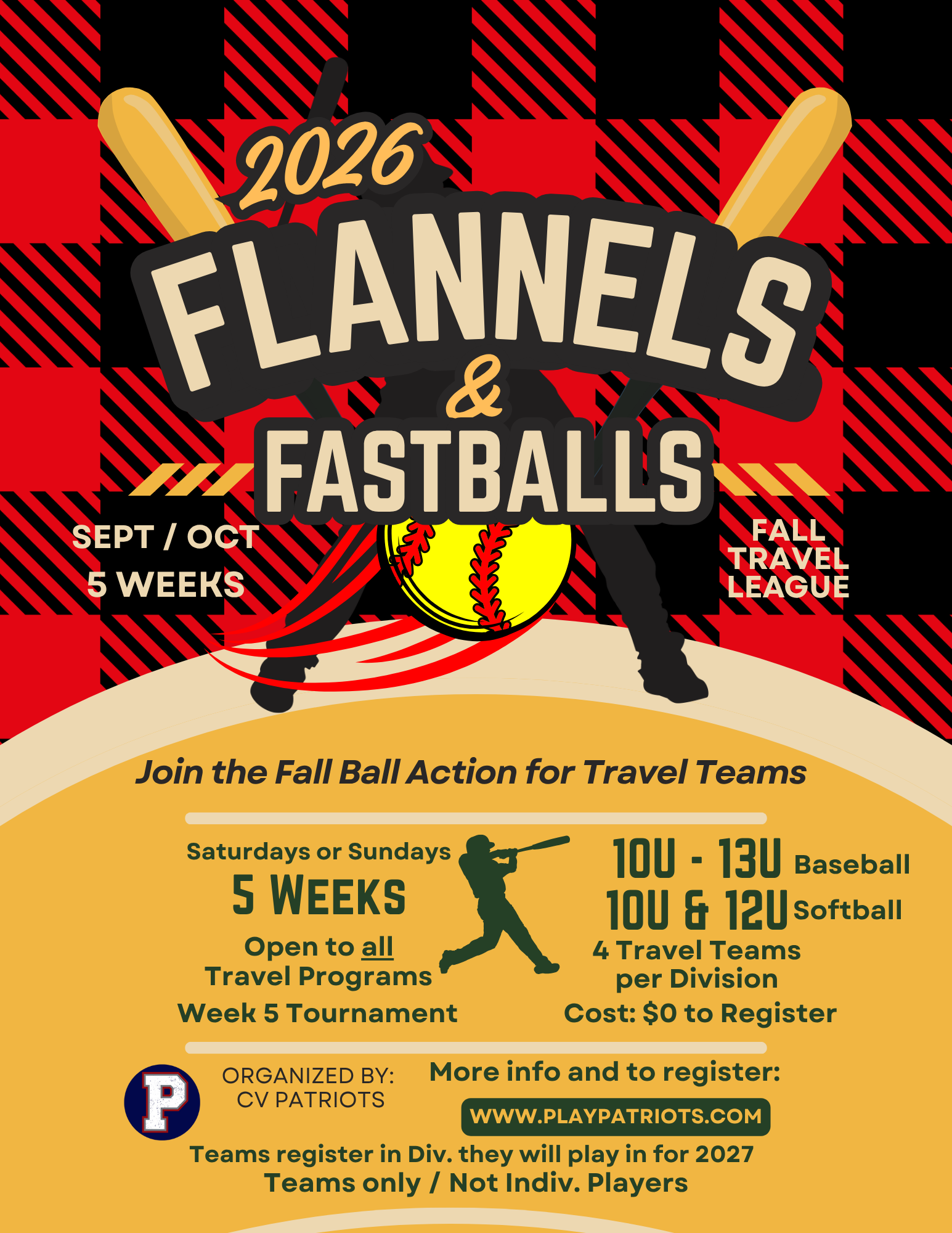2026 CV Patriots Flannel's & Fastballs Games. Competitive Travel Softball focused on building skills, character, and a love of the game on and off the field. The CV Patriots program supports teams from 8U - 14U. Leveraging local league relationships, we'll play a 5 week season (1/2 home/ 1/2 away) during Aug- Oct, weather dependent.
